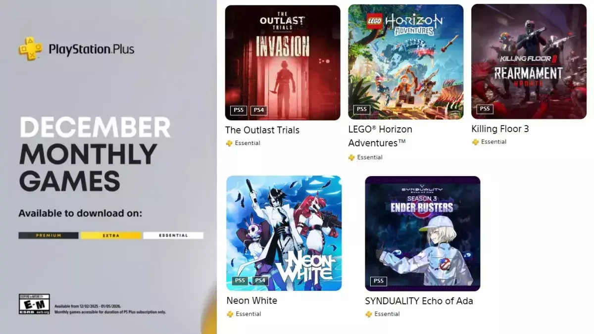 Πέντε παιχνίδια αντί για τρία προσφέρει το PlayStation Plus Essential τον Δεκέμβριο 2025, σε μια ασυνήθιστη κίνηση που περιλαμβάνει κυρίως multiplayer τίτλους. Τα παιχνίδια Neon White, LEGO Horizon Adventures, The Outlast Trials, Killing Floor 3 και Synduality Echo of Ada θα είναι διαθέσιμα από τις 2 Δεκεμβρίου έως τις 5 Ιανουαρίου 2026.